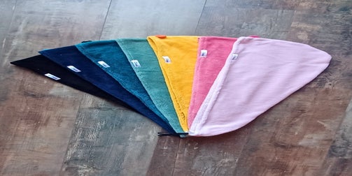 La forme de cette serviette enveloppe votre chevelure. Il suffit de la placer sur votre tête, de torsader la pointe et de la faire revenir vers l'arrière afin de la coincer au niveau de votre nuque. Un bouton ton sur ton permet de la fermer facilement pour qu'elle tienne.